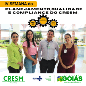Entre os dias 22 e 25 de abril, O Complexo de Referência Estadual em Saúde Mental Prof. Jamil Issy – CRESM, Unidade do Governo de Goiás, sediou a IV Semana do Planejamento, Qualidade e Compliance, com o tema “Cultura Organizacional”. Promovido pela assessora de planejamento Poliana Rosa, a assessora de qualidade Veruska Ariadna, a assistente da qualidade, Suria Naiara e o analista de compliance Jose Francisco da Silva Carneiro, o evento movimentou toda a unidade com uma programação intensa e dinâmica. A abertura contou com palestras, coffeebreaks, gincanas e momentos de integração, fortalecendo a importância da cultura organizacional no ambiente de trabalho.