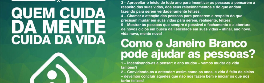 O primeiro mês do ano é marcado pela campanha Janeiro Branco, que tem como principal objetivo discutir a saúde mental. Idealizado pelo psicólogo Leonardo Abrahão há cinco anos, o projeto convida as pessoas a refletirem sobre suas vidas, a qualidade dos relacionamentos e incentiva o debate sobre o tema em todos os espaços.